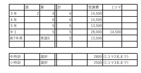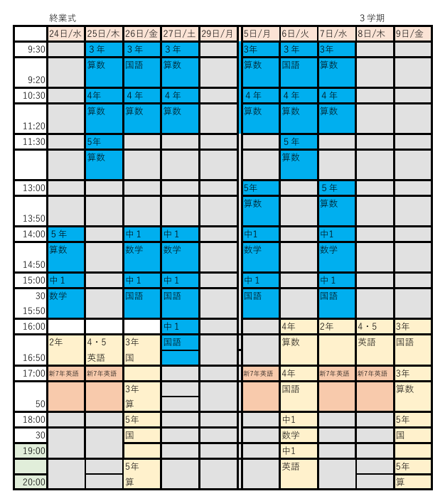 令和7年 冬期講習の時間割