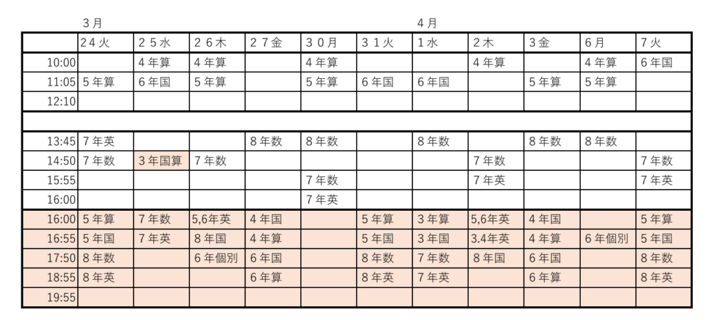 16時以降はレギュラー受講生の時間割となります。